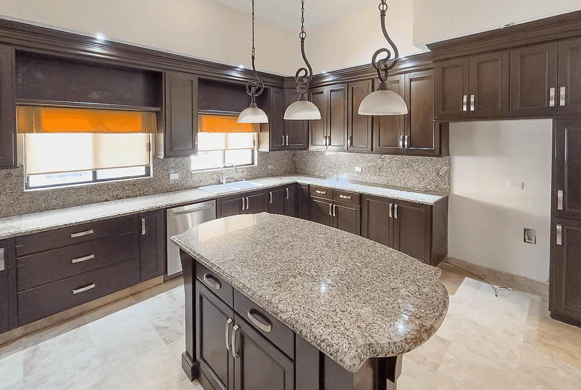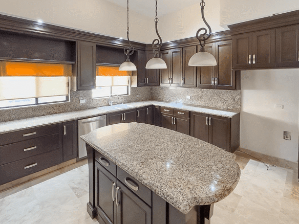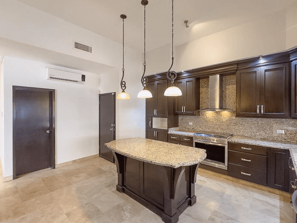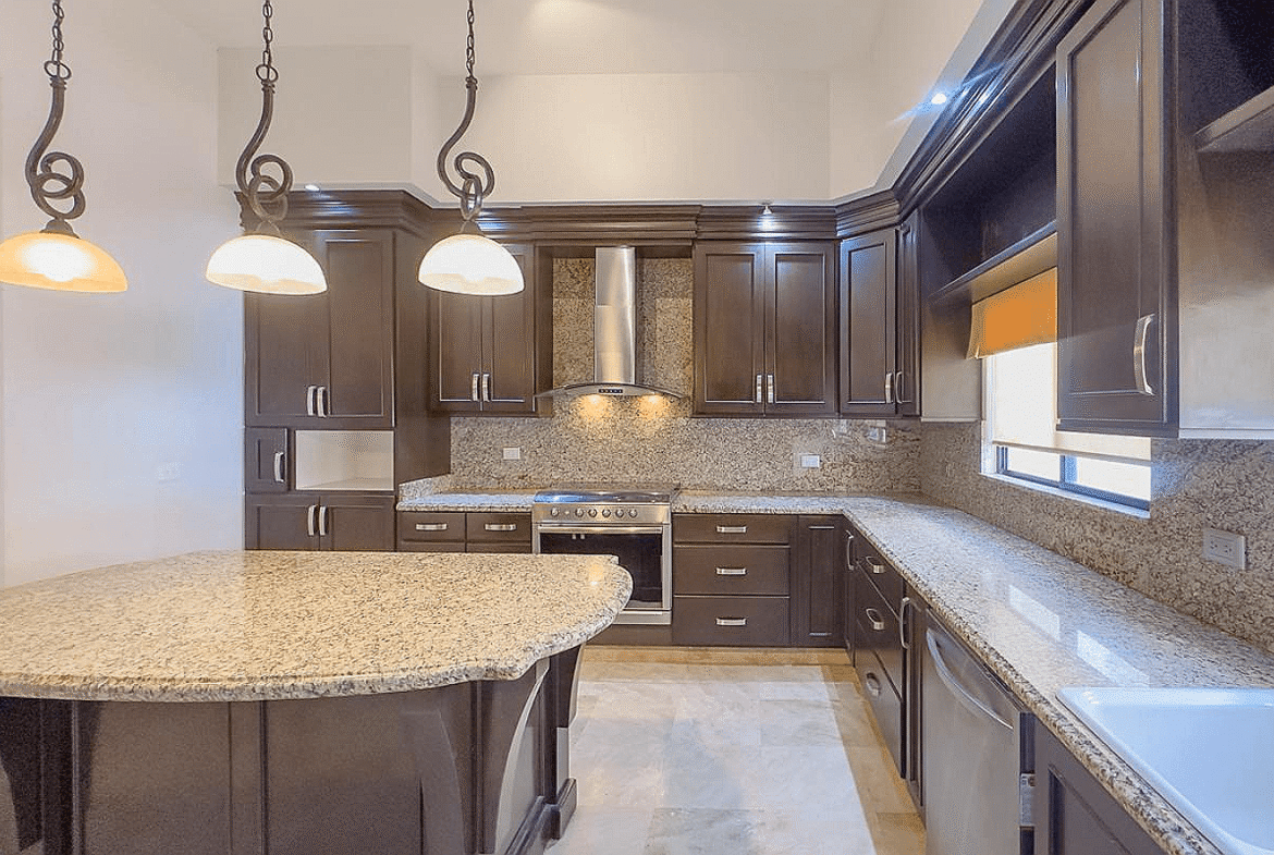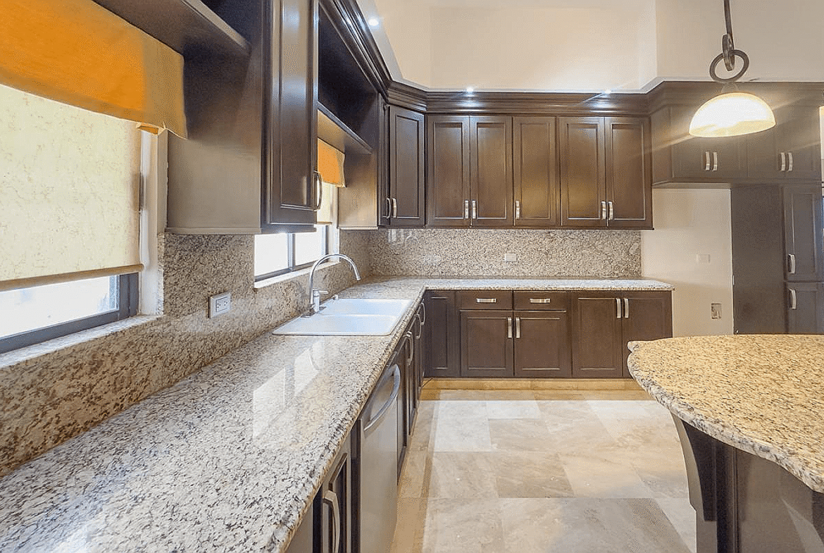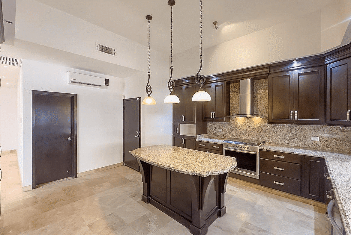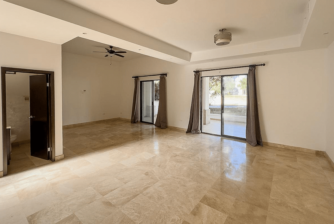 La propiedad cuenta con 388 m² de terreno y 349 m² de construcción, desarrollados en dos niveles con una distribución inteligente que privilegia la amplitud, la iluminación natural y la conexión visual permanente con el campo de golf. Desde el acceso principal se percibe una sala de doble altura, comedor y estancia que se integran con grandes ventanales hacia el exterior, creando una experiencia residencial elegante y funcional. La cocina integral destaca por su cubierta de granito, isla central, alacena y equipamiento de calidad, ideal para quienes disfrutan cocinar y recibir invitados.