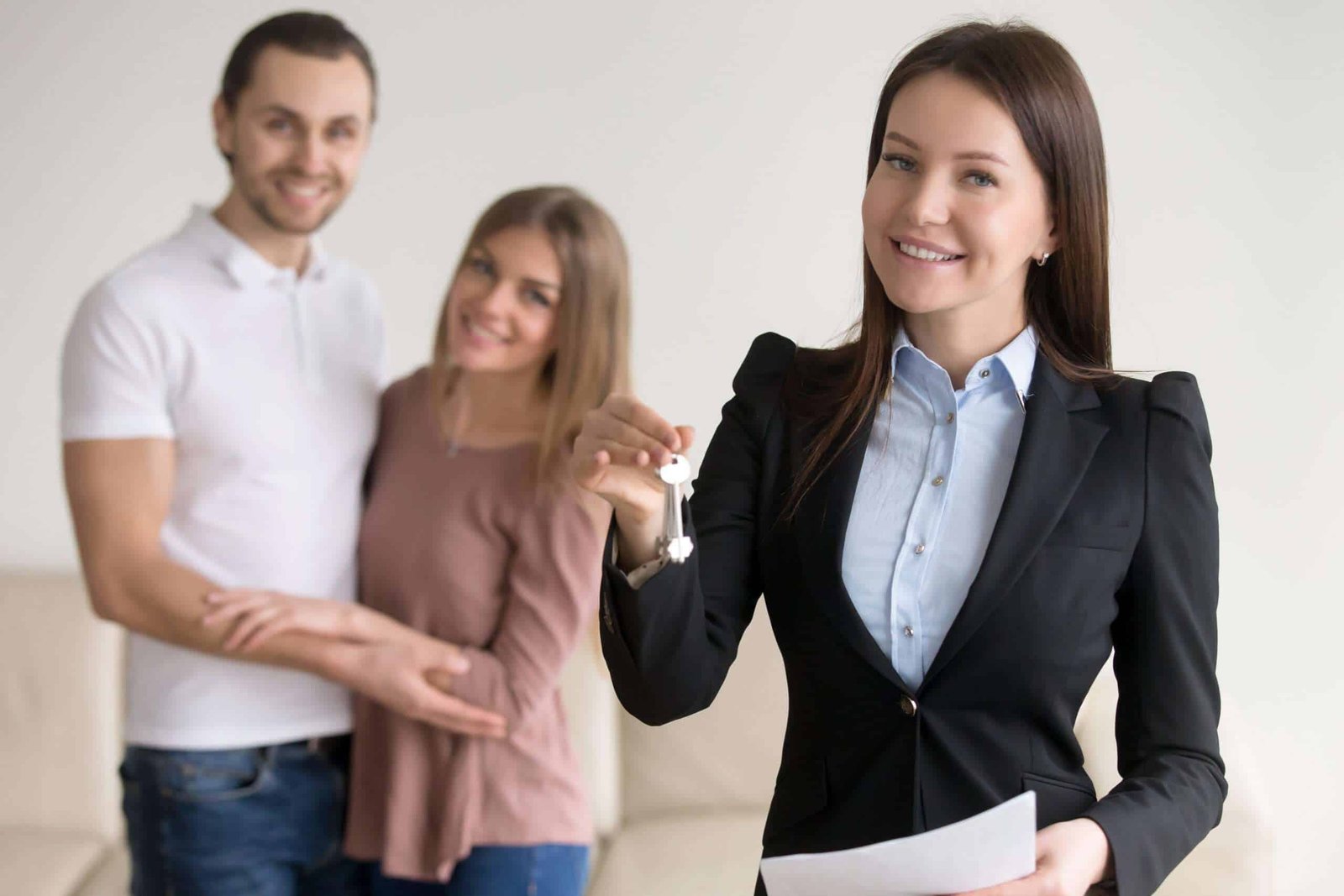 Reliable Trusted Real Estate Agency. Friendly Female Broker In The Foreground Holding Keys To New Apartment, Deal With Buyers Or Renters, Applying For Mortgage, Affordable Prices For Property